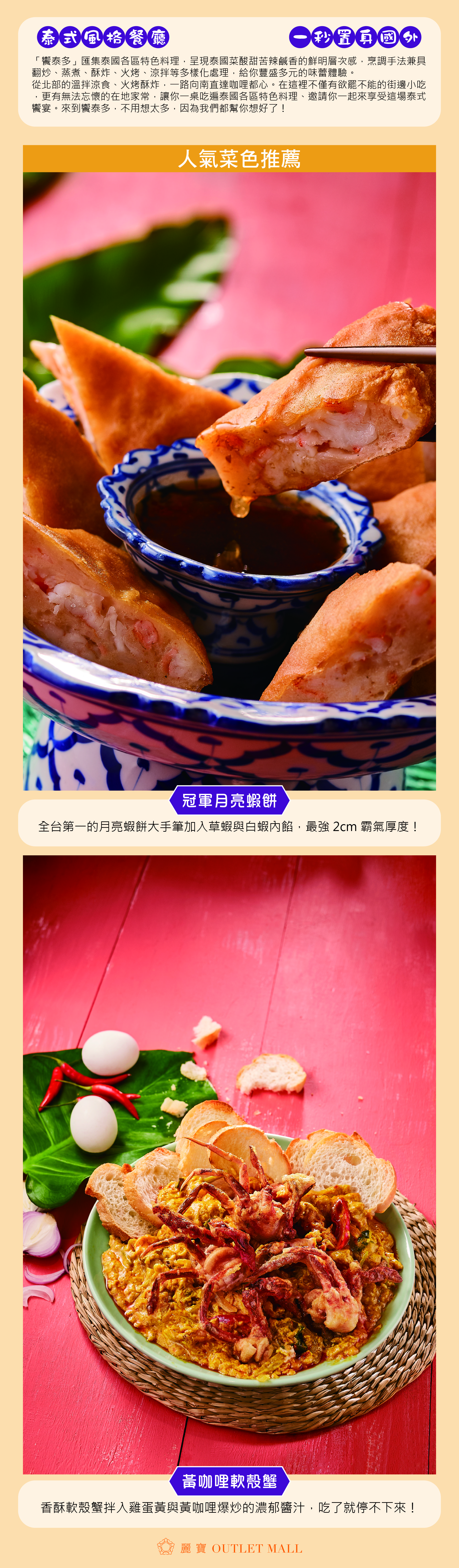 從北部的溫拌涼食、火烤酥炸,一路向南直達咖哩都心。在這裡不僅有欲罷不能的街邊小吃,更有無法忘懷的在地家常,讓你一桌吃遍泰國各區特色料理、邀請你一起來享受這場泰式饗宴。來到饗泰多,不用想太多,因為我們都幫你想好了!